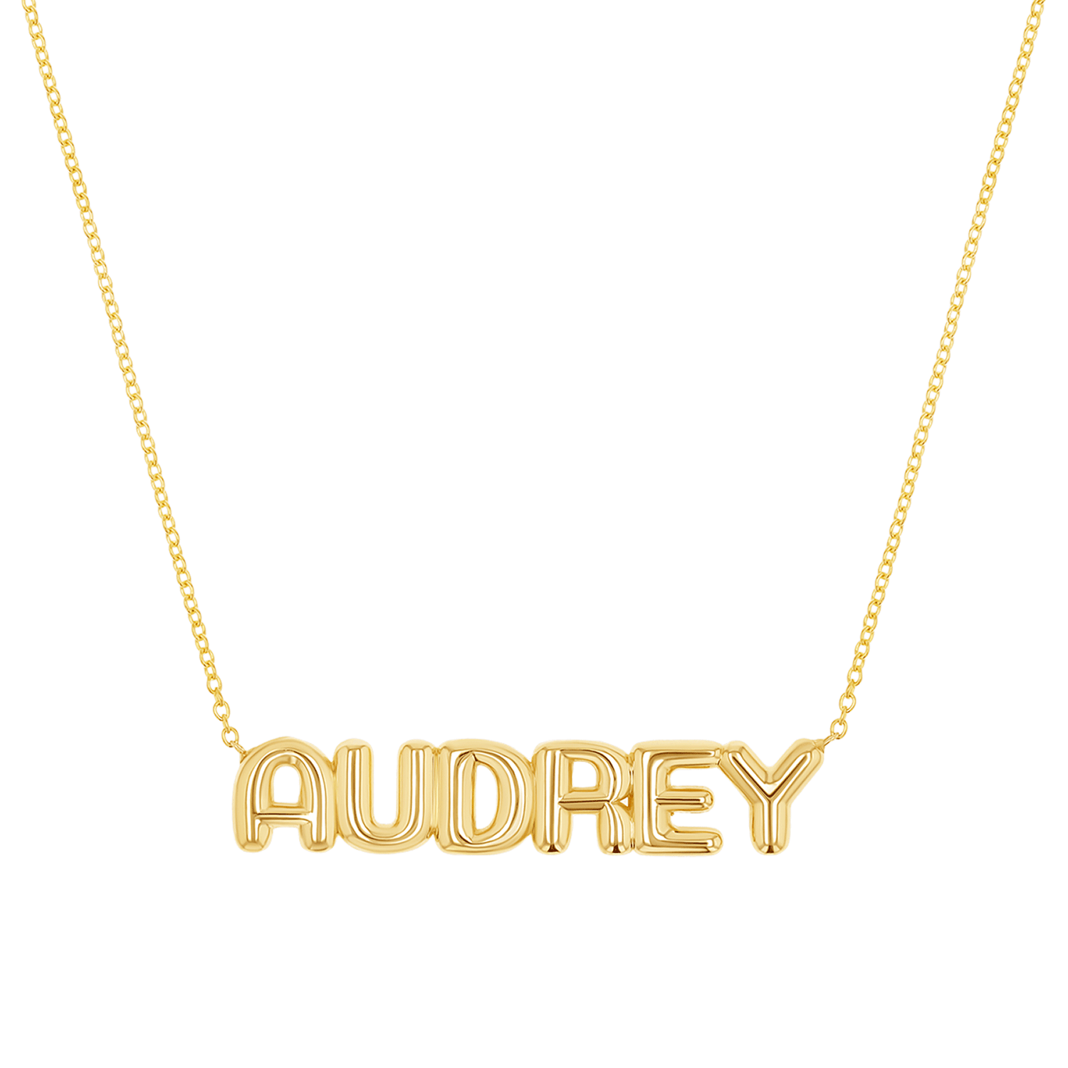 A bubbly chic way to make an entrance, our Balloon Name Necklace gets personal in a fun way. These letters are created in a custom designed font, giving a helium filled look to each letter. Available in 925 Sterling Silver, White & Rose gold and many chain lengths, Pandora Jewels gives you full control of your custom name necklace.
